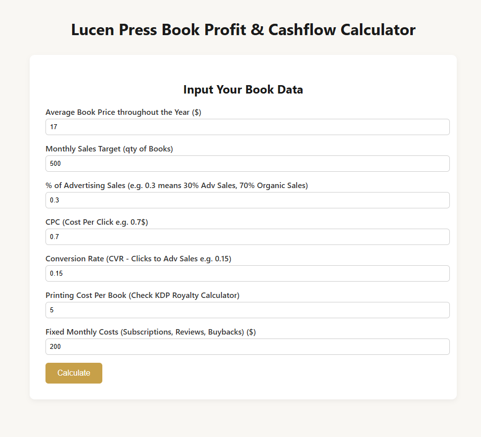 Thatâs why the Lucen Hub Book Profit & Cashflow Calculator focuses on a set of critical input and output values that every author should master before hitting âpublish.â